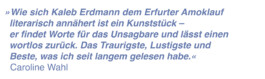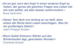 Kaleb Erdmann wurde 1991 in Witten an der Ruhr geboren und ist im Ruhrgebiet, in Bayreuth, Erfurt und München aufgewachsen. Heute ist er Autor und Dramatiker.